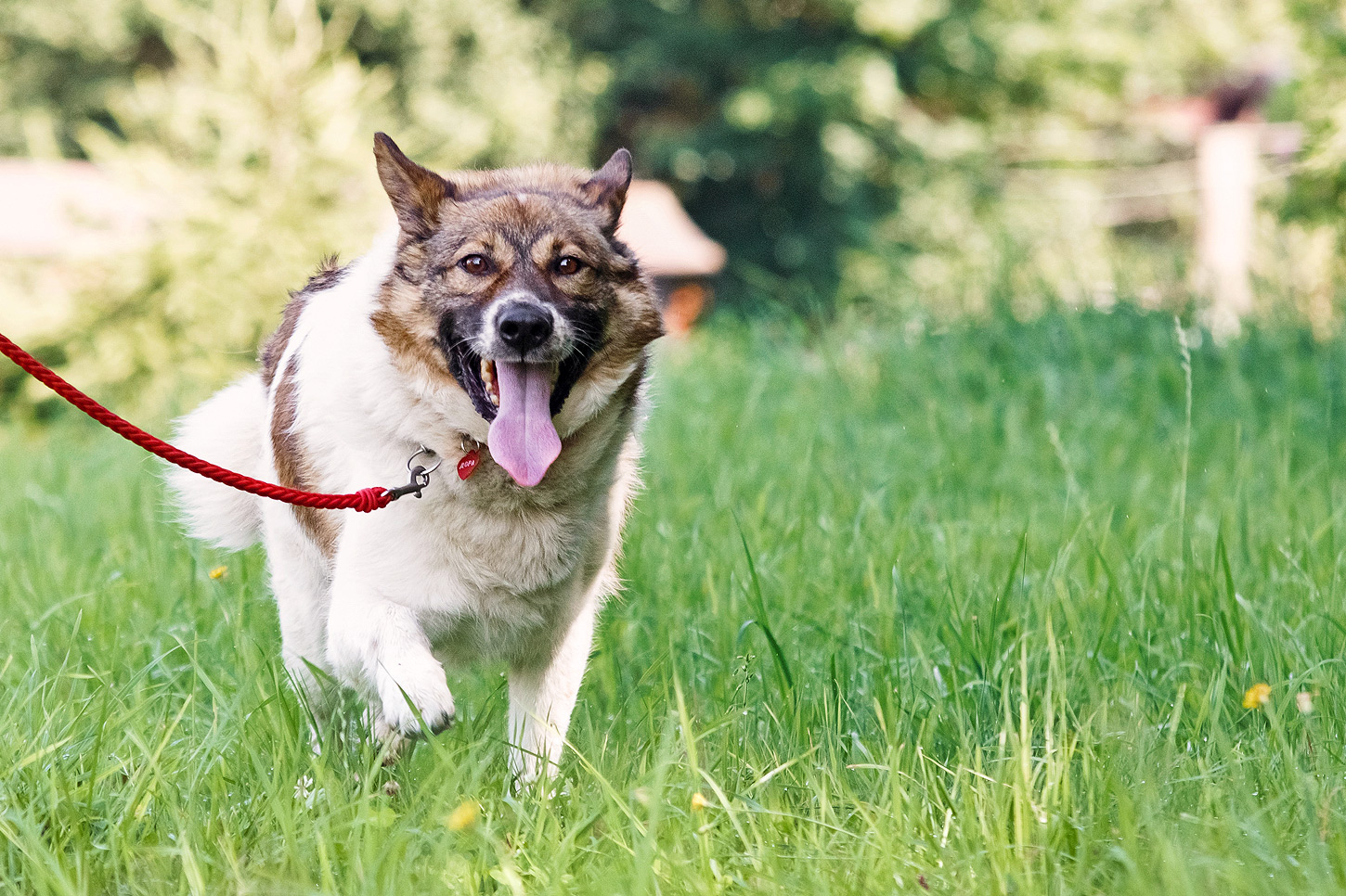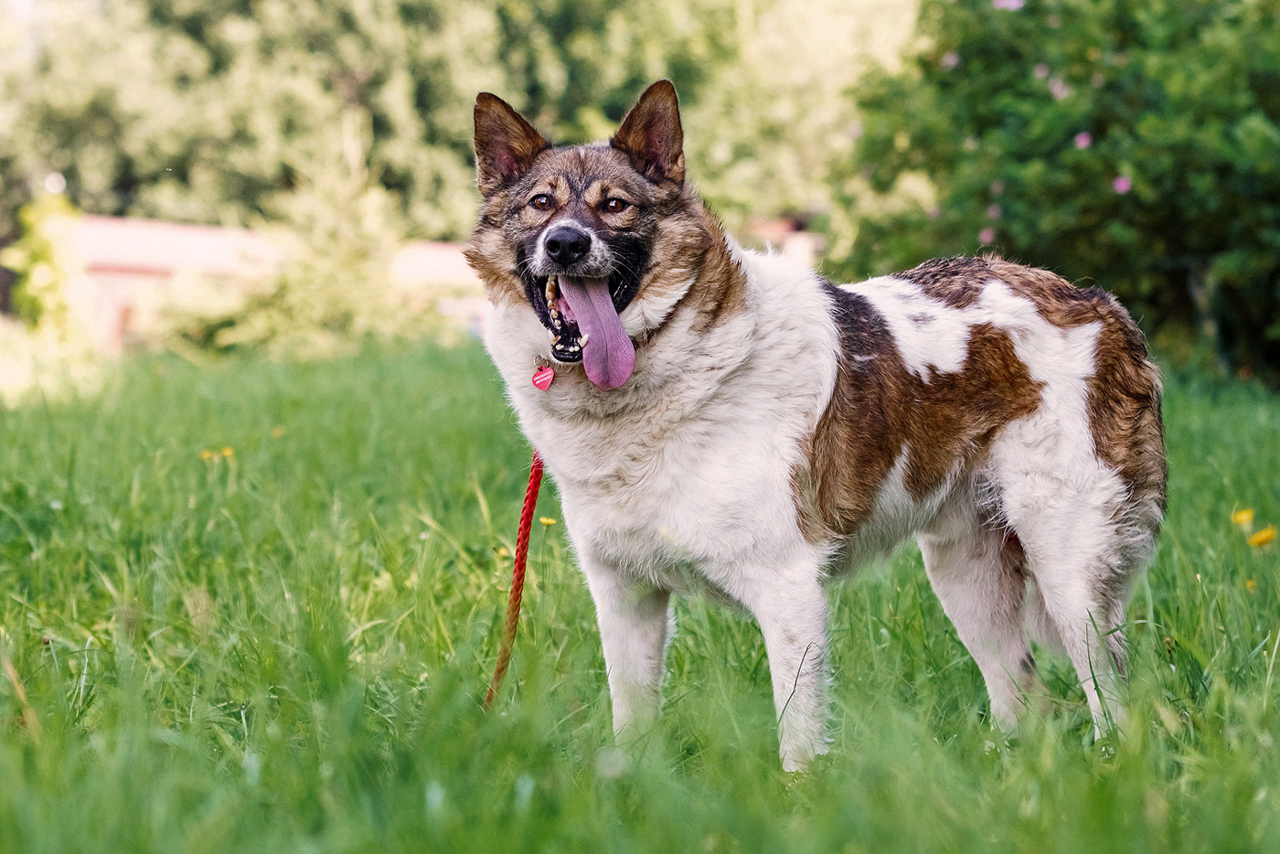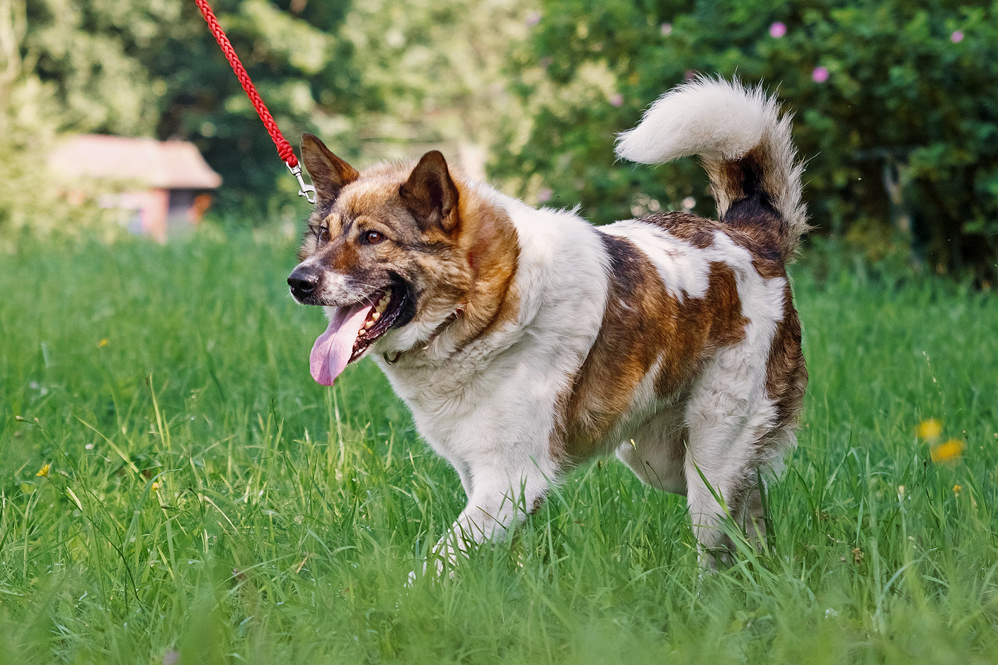 Han går bra i koppel men är inte helt bekväm. Om kopplet nuddar benen eller trasslar sig under honom blir han rädd, så mer träning kommer att behövas.