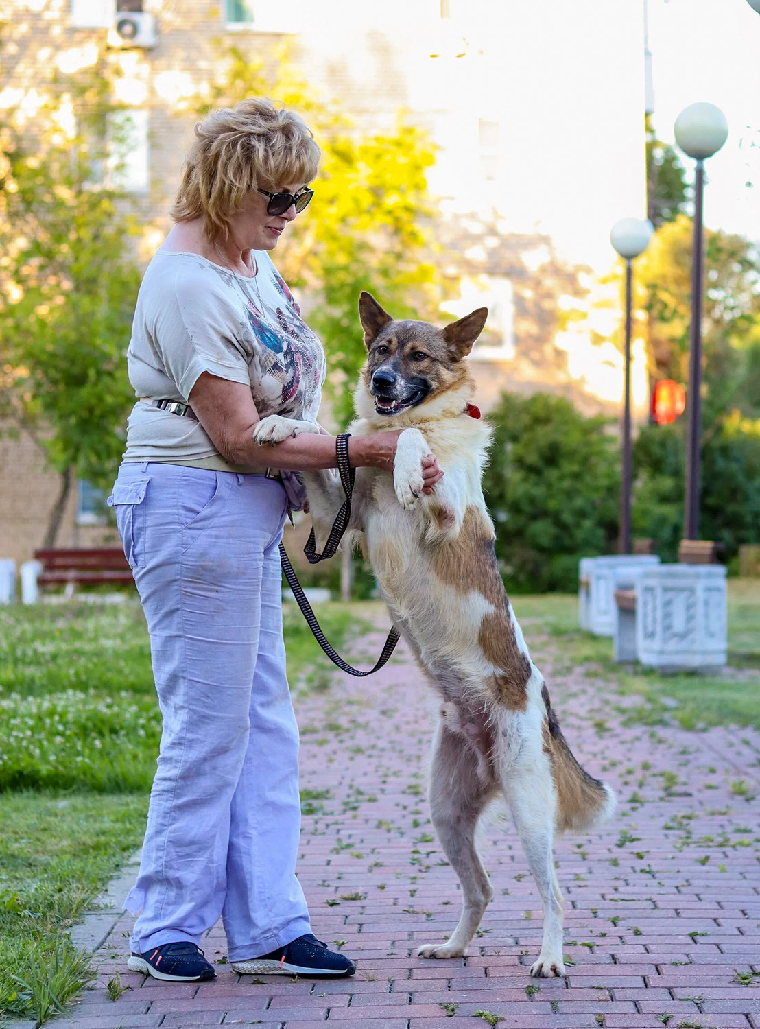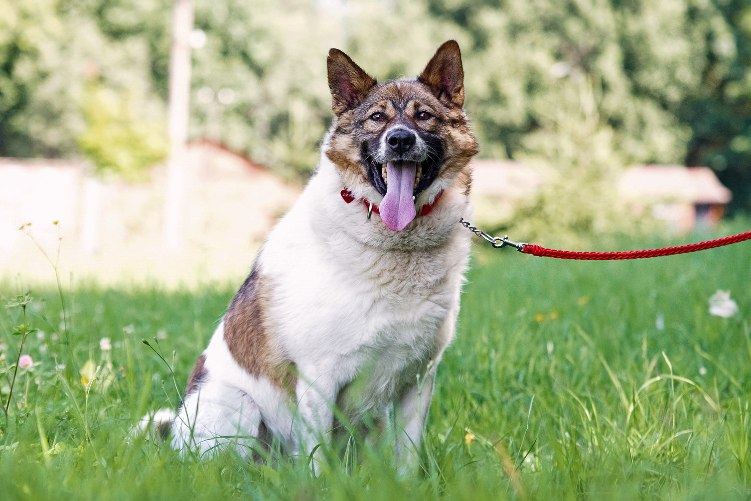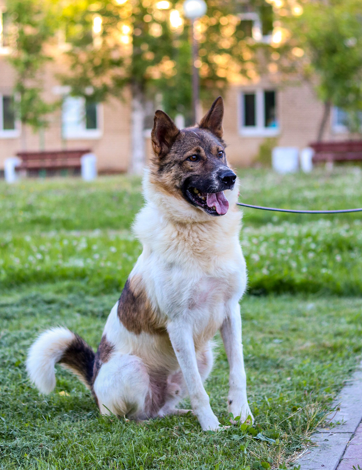 Han går bra i koppel men är inte helt bekväm. Om kopplet nuddar benen eller trasslar sig under honom blir han rädd, så mer träning kommer att behövas.